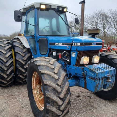 Ford 7810 Force 3 Turbo model med 40 km gearkasse og hydr. Bremseventil. Traktoren er med 18,4 x38 tvillinghjul med ring og 4 låse pr hjul, går godt i motor, gearkasse og hydr, Traktoren løber 41 km på vejen efter GPS, om det en er der kommer fra England eller den fra Tyskland ved jeg ikke. Lidt smårust på den.